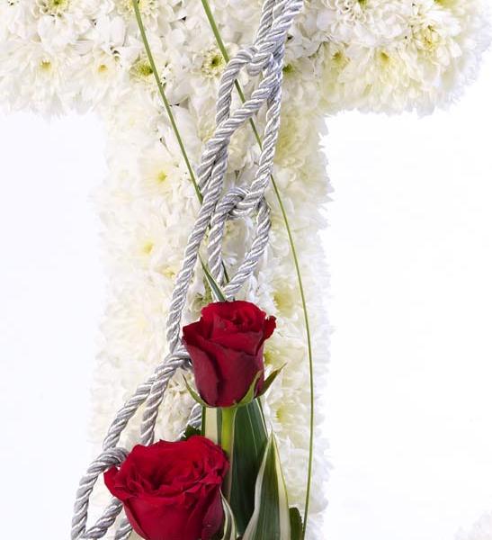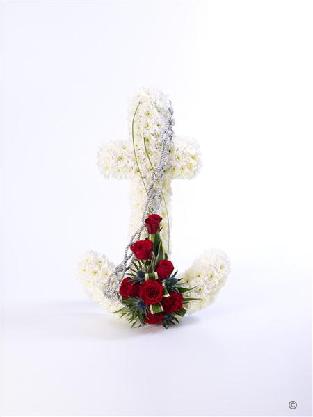 An anchor shaped design using a mass of white double spray chrysanthemums with a coloured spray of flowers and ribbon edging of your choice. The tribute is finished with green foliage and a silver cord.