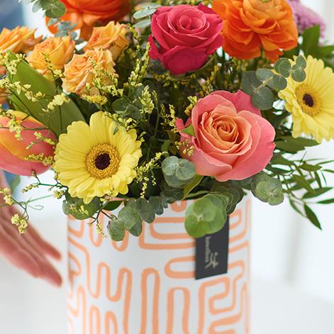 A vibrant hatbox, arranged as a handtied in water. Can include shades of pinks, oranges, yellows, purples and greens, filled with the finest seasonal selection of flowers.