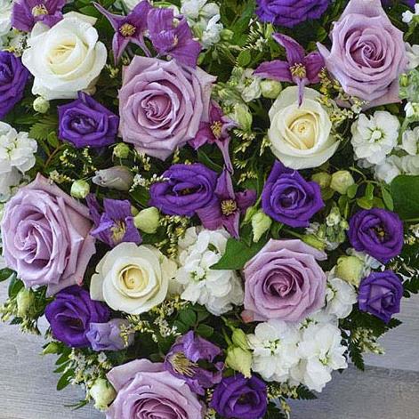 A beautiful loose hearts in shades of Lilacs, Purples and whites featuring roses, mixed with other flowers and foliage to compliment. Standard size is 12"