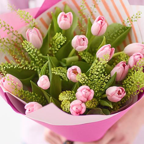 A beautiful bouquet of pink spring tulips, expertly arranged with foliage by a florist.