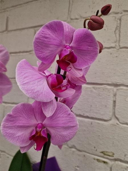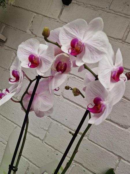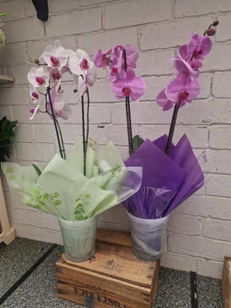 An elegant Phalaenopsis Orchid, gift wrapped and presented in a glass container. Why not make this gift extra special by adding a box of chocolates!