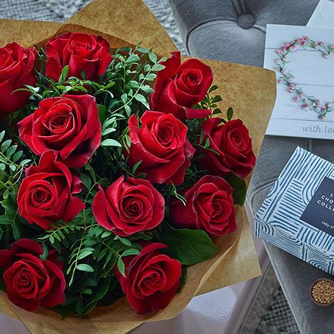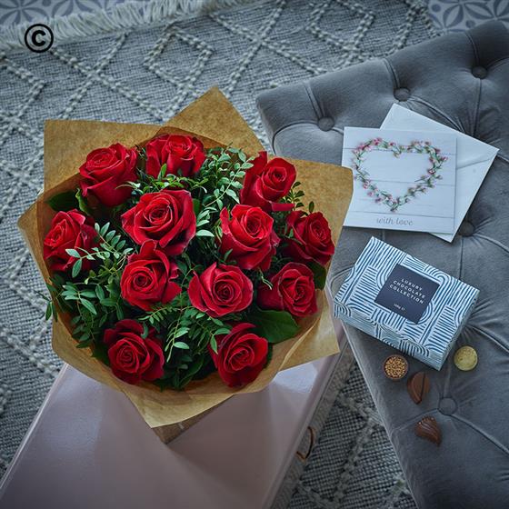 Want to woo someone with flowers? Our stunning 12 red rose gift set includes a pink rose gift card and a box of luxury chocolates to make this gift extra special for that special someone in your life.