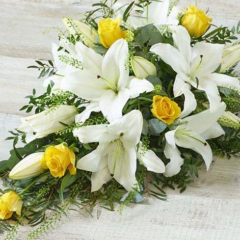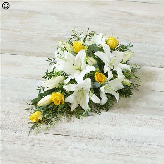 An elegant tear drop shaped arrangement featuring delicate foliage and large fragrant oriental lilies, combined with gorgeous roses.