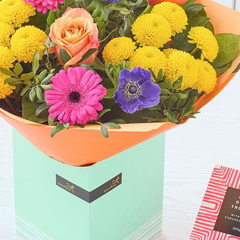 A sweet little giftbox with a bright handcrafted bouquet inside, plus a selection of scrumptious chocolates.