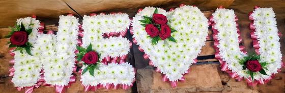 The ideal tribute for people who want to express their love to their loved one as a group. This beautiful 'We <3 U' Tribute is ribbon edged in a colour of your choice, based in white chrysanthemum then finished with clusters of flowers in the colour of your choice.